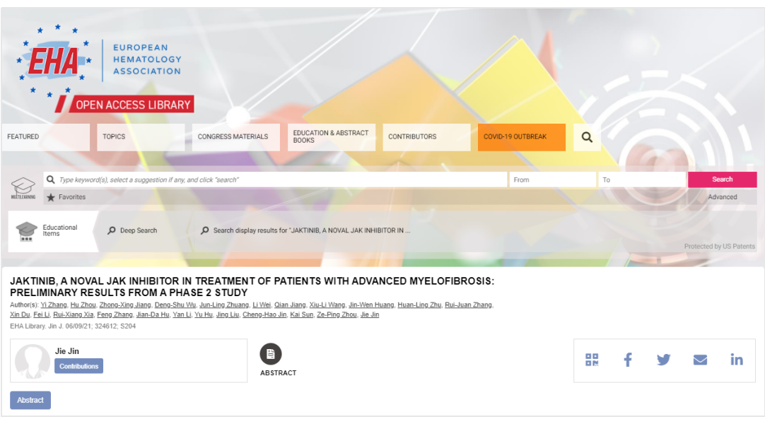 欧洲血液学领域规模最大的国际学术盛会——第26届欧洲血液学协会年会(2021 EHA)于2021年6月9日起正式在线上召开。在本次会议最具学术价值的口头报告环节,杰克替尼治疗中、高危骨髓纤维化的II期临床研究结果(方案编号:ZGJAK002)由本研究主要研究者浙江大学第一附属医院血液科金洁教授于2021年6月11日上午9点(欧洲中部时间)在EHA大会上公布,标志着国际血液学界对该研究的高度认可。