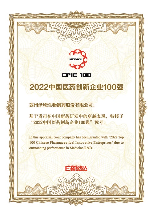 近日,E药经理人发布了 2022年度 “中国医药创新企业100强” 榜单。作为一家专注于肿瘤、出血及血液疾病、免疫炎症性疾病和肝胆疾病等多个治疗领域的创新驱动型化学及生物新药研发和生产企业,泽璟制药再次获评“2022中国医药创新企业100强 ”。