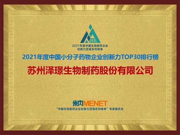 2022年9月16日,由米内网主办的“惟创新者行稳致远——2021年度中国生物医药企业创新力百强系列榜单发布会”在线上举行。会上重磅发布了“2021年度中国生物医药企业创新力百强系列榜单”。泽璟制药凭借出色的创新能力,获得“中国生物医药企业创新力百强系列榜单”专家委员会的认可,荣登“2021年度中国小分子药物企业创新力TOP30排行榜”。