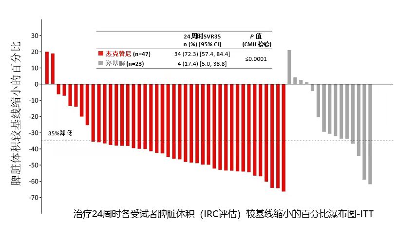 主要终点:24周时脾脏体积缩小≥35%(SVR35)的受试者占所有受试者的比例(独立审评委员会);次要终点:包括最佳脾缓解率(定义为在任何时候达到SVR35)、总症状评分(TSS50)降低≥50%的患者比例、贫血改善、安全性等。