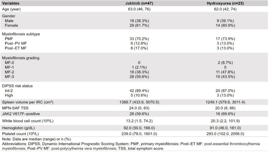 该研究入组标准为年龄≥18岁的原发性MF、真性红细胞增多症后MF和原发性血小板增多症后MF患者,DIPSS评分为中危-2或高危,既往未接受或接受≤10天JAKi治疗,随机分组(2:1)至杰克替尼100 mg bid治疗组和羟基脲0.5 g bid治疗组。期中分析(数据截止2022年4月28日)纳入47例接受杰克替尼治疗患者和23例接受羟基脲治疗患者,两组患者基线特征基本均衡。