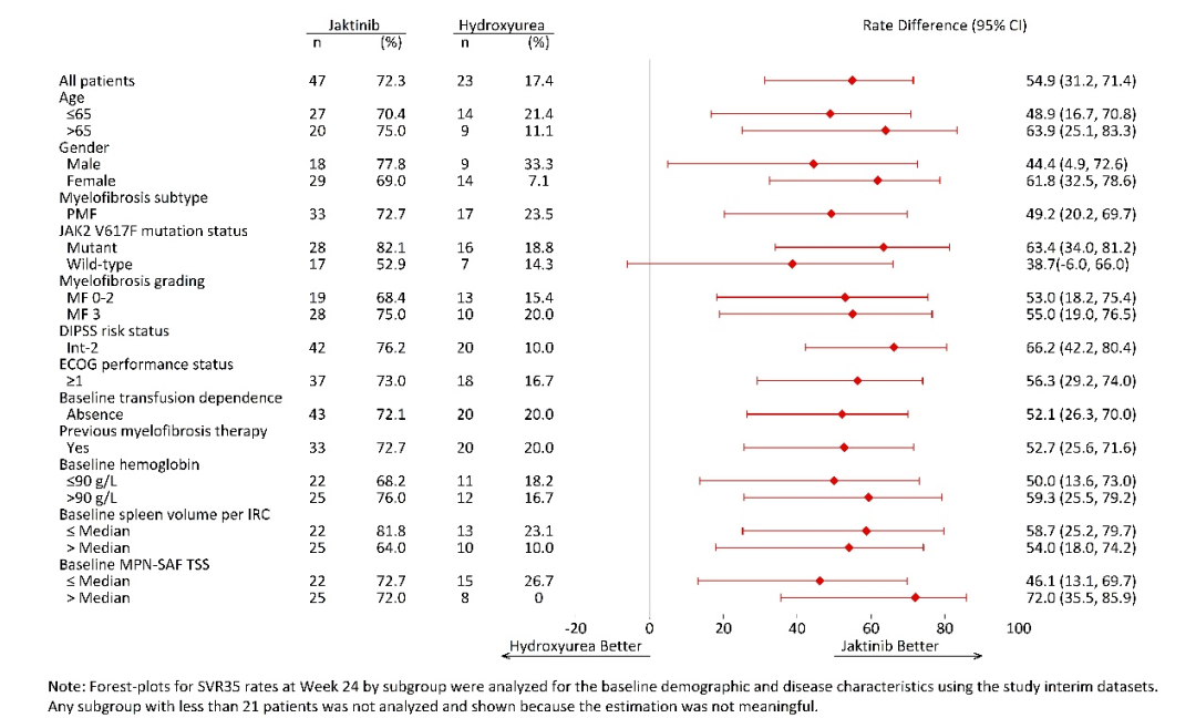 在所有预设亚组中,杰克替尼治疗与羟基脲治疗相比,具有明显的脾脏反应优势(图2)。杰克替尼组的脾响应最佳有效率为80.9%,羟基脲组为26.1% (p≤0.0001)。脾脏体积相比基线变化的最大百分比中位值分别为-46.59%和-18.50%。