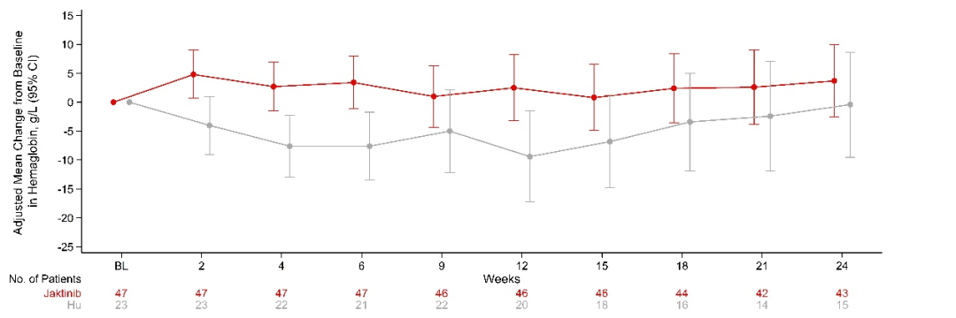 在安全性方面,杰克替尼的总体安全性好于羟基脲。杰克替尼组≥3级治疗期不良事件(TEAE)、严重TEAE、导致永久停药以及导致剂量减少或暂停用药TEAE的发生率均低于羟基脲。最常见的≥3级血液学TEAE(任一组发生率≥20%)是贫血(杰克替尼组25.5% vs. 羟基脲组43.5%)、血小板减少(17.0% vs 39.1%)、白细胞减少(2.1% vs. 21.7%)、中性粒细胞减少(2.1% vs 21.7%)和淋巴细胞计数降低(2.1% vs 13.0%)。