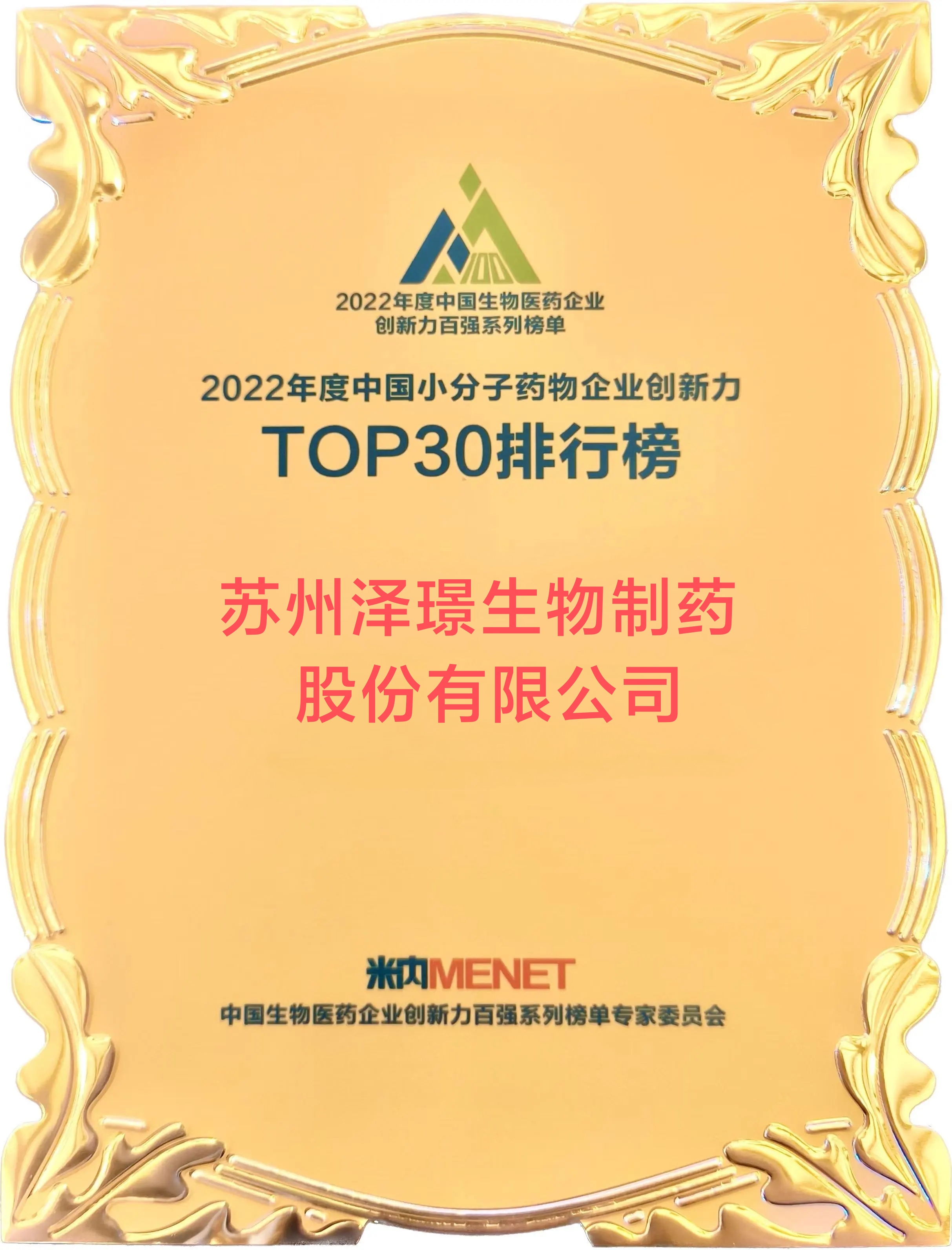 2023年6月28日,在由米内网主办的“2023米思会”上,2022年度中国生物医药企业创新力百强系列榜单正式发布。泽璟制药凭借卓越的创新研发能力,成功入选“2022年度中国小分子药物企业创新力TOP30排行榜”。