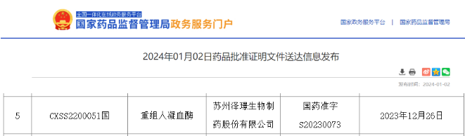 2024年1月2日,泽璟制药收到国家药品监督管理局核准签发的《药品注册证书》,公司自主研发的重组人凝血酶获批上市,用于“成人经标准外科止血技术(如缝合、结扎或电凝)控制出血无效或不可行,促进手术创面渗血或毛细血管和小静脉出血的止血”。